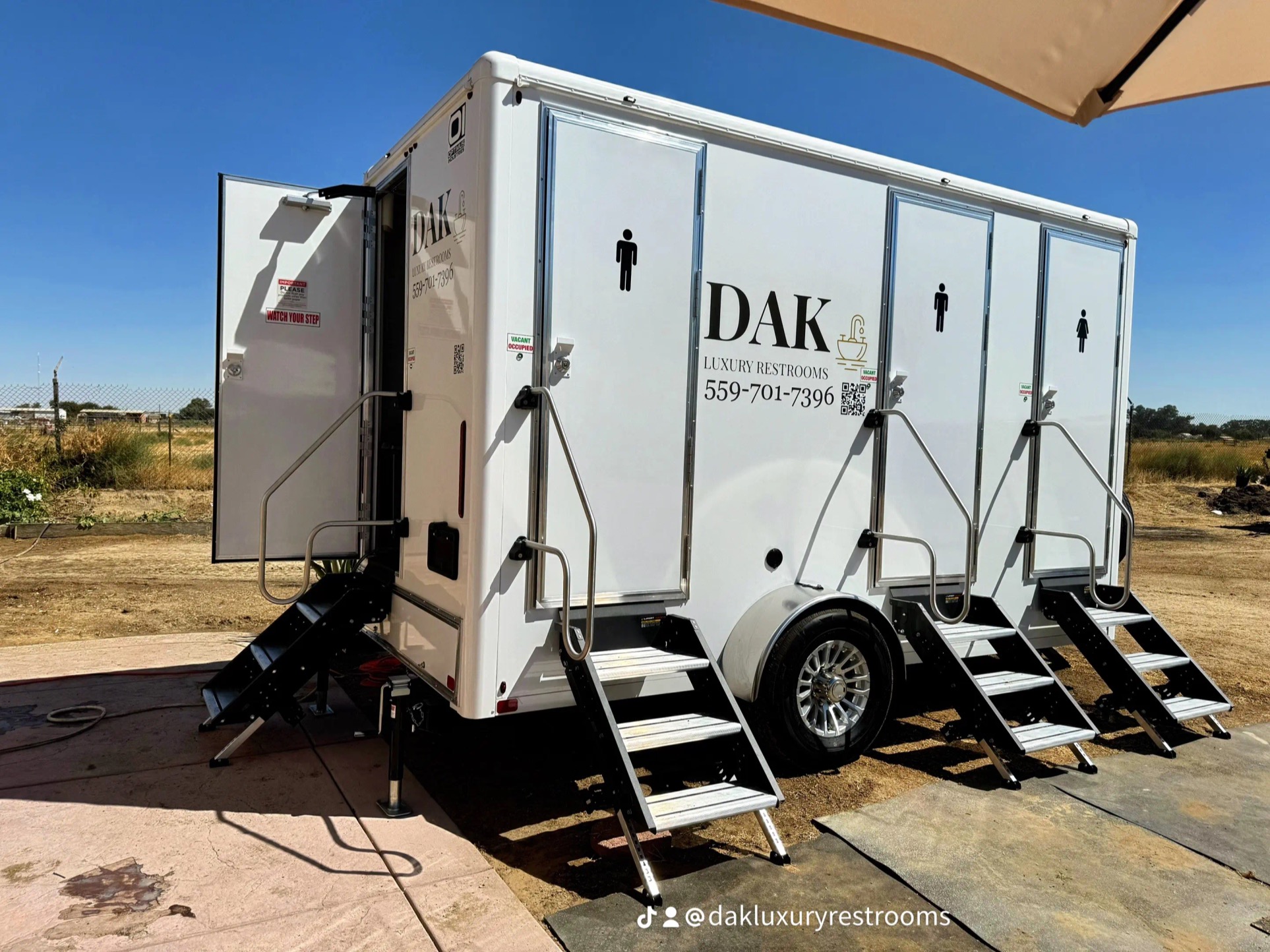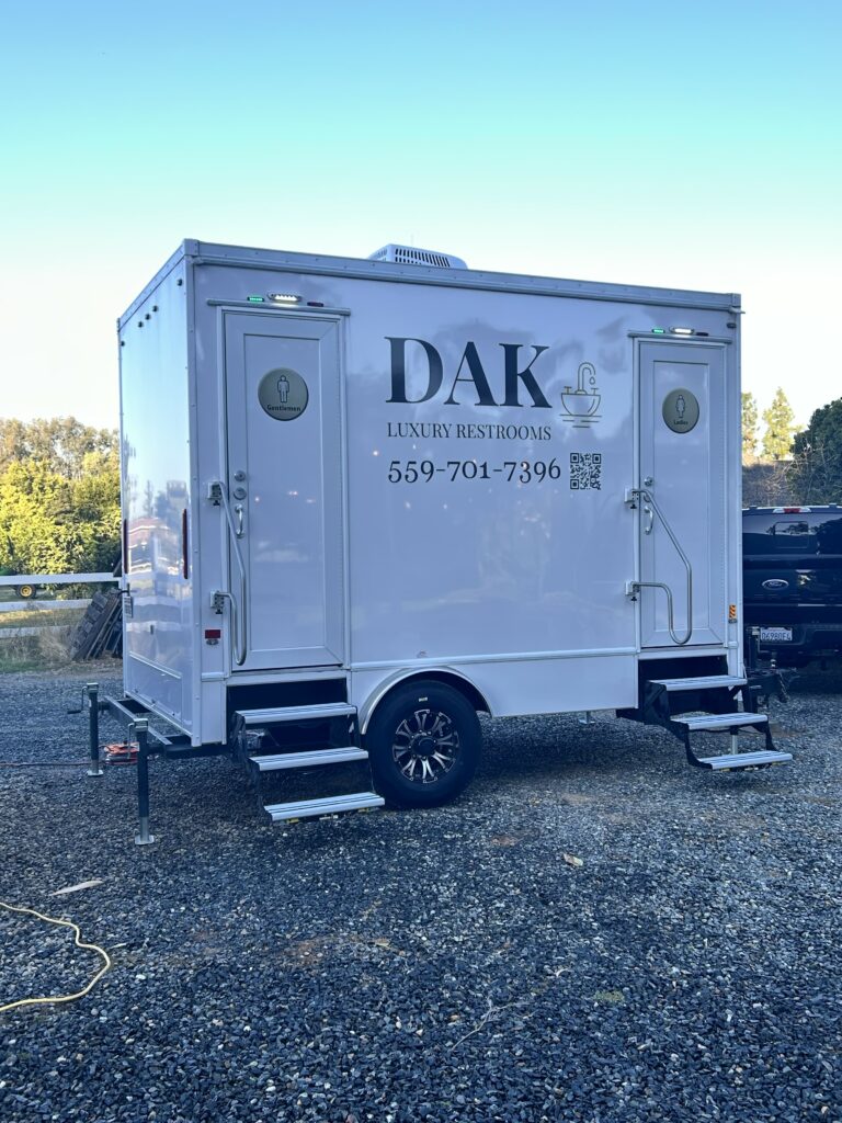 DAK Luxury Restroom Trailers proudly serves Fresno, Madera, Visalia, Tulare, and surrounding areas in California. Our restroom trailers are perfect for any event, providing convenience and style wherever you need them.